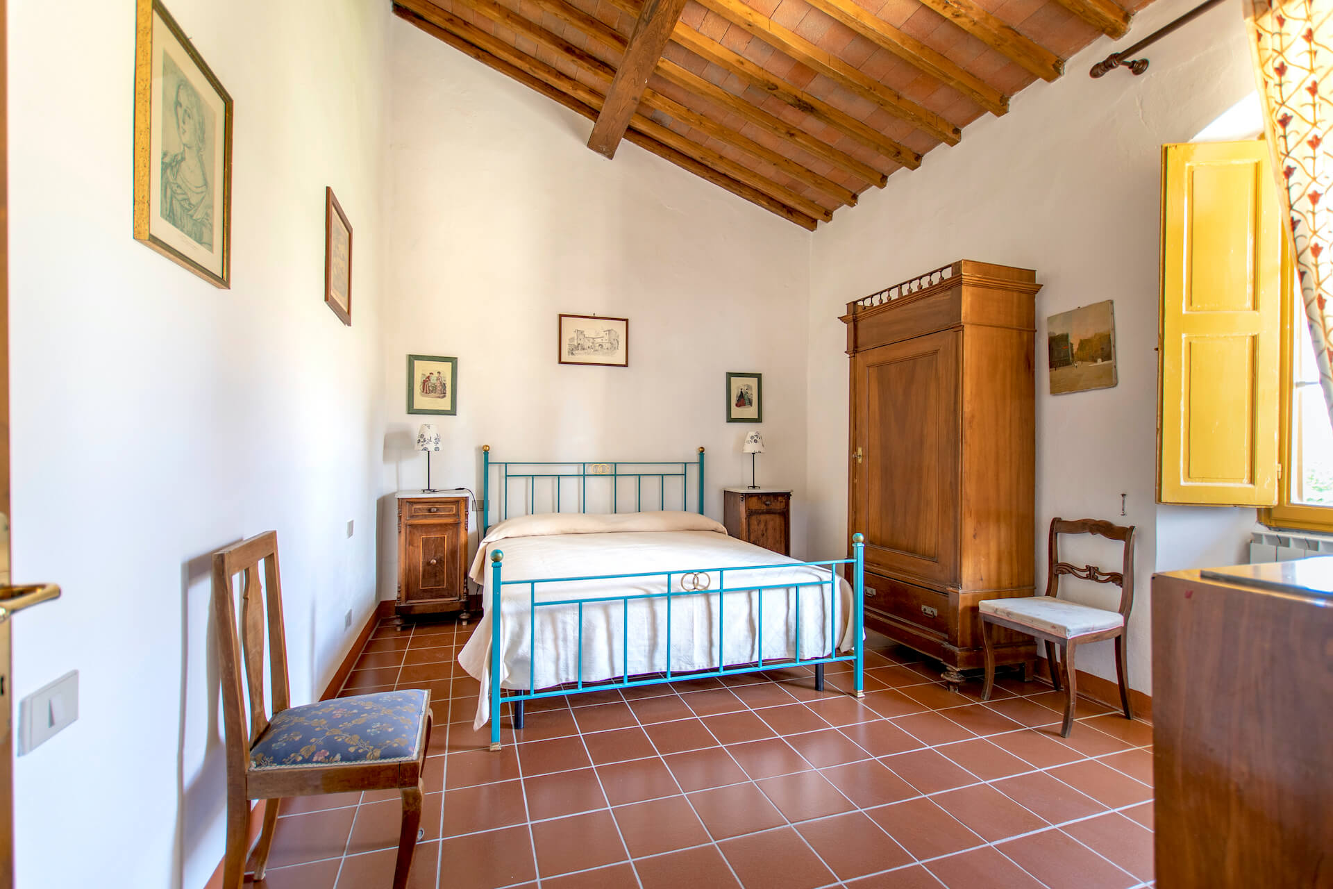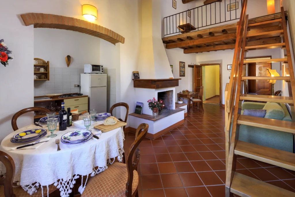 Situato al primo piano della Fattoria, l’appartamento Due Palchi, esposto a nord e quindi particolarmente fresco in estate, dispone di due ampie camere — una matrimoniale e una con due letti singoli — che condividono un grande bagno con cabina doccia e servizi. L’ingresso si apre su un accogliente soggiorno con divano, caminetto, zona pranzo e angolo cottura. Un soppalco con divano letto matrimoniale può ospitare una quinta persona e dà il nome all’appartamento